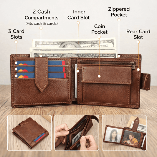RFID Leather Wallet for Men – Bifold with Zipper Pocket & Large Capacity
