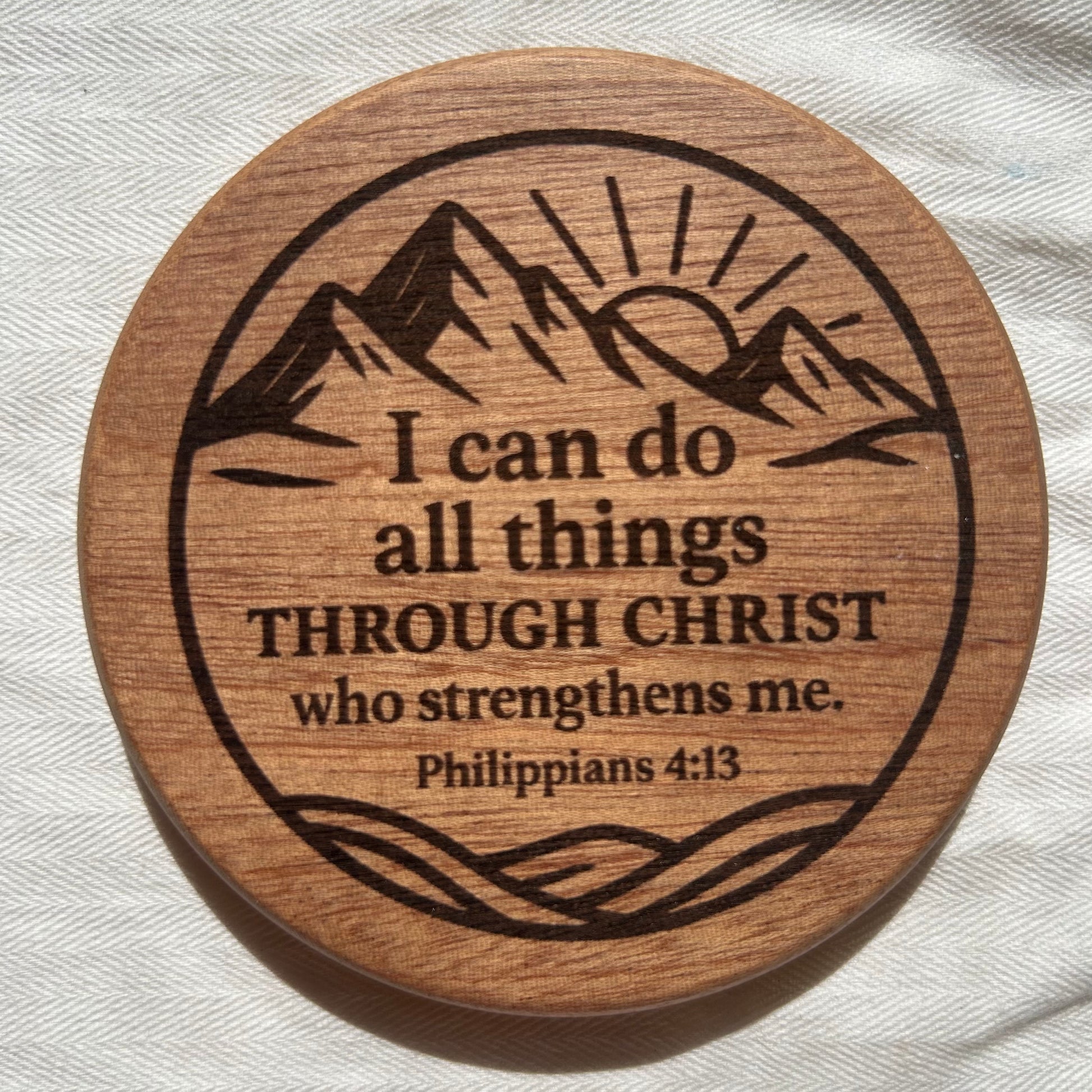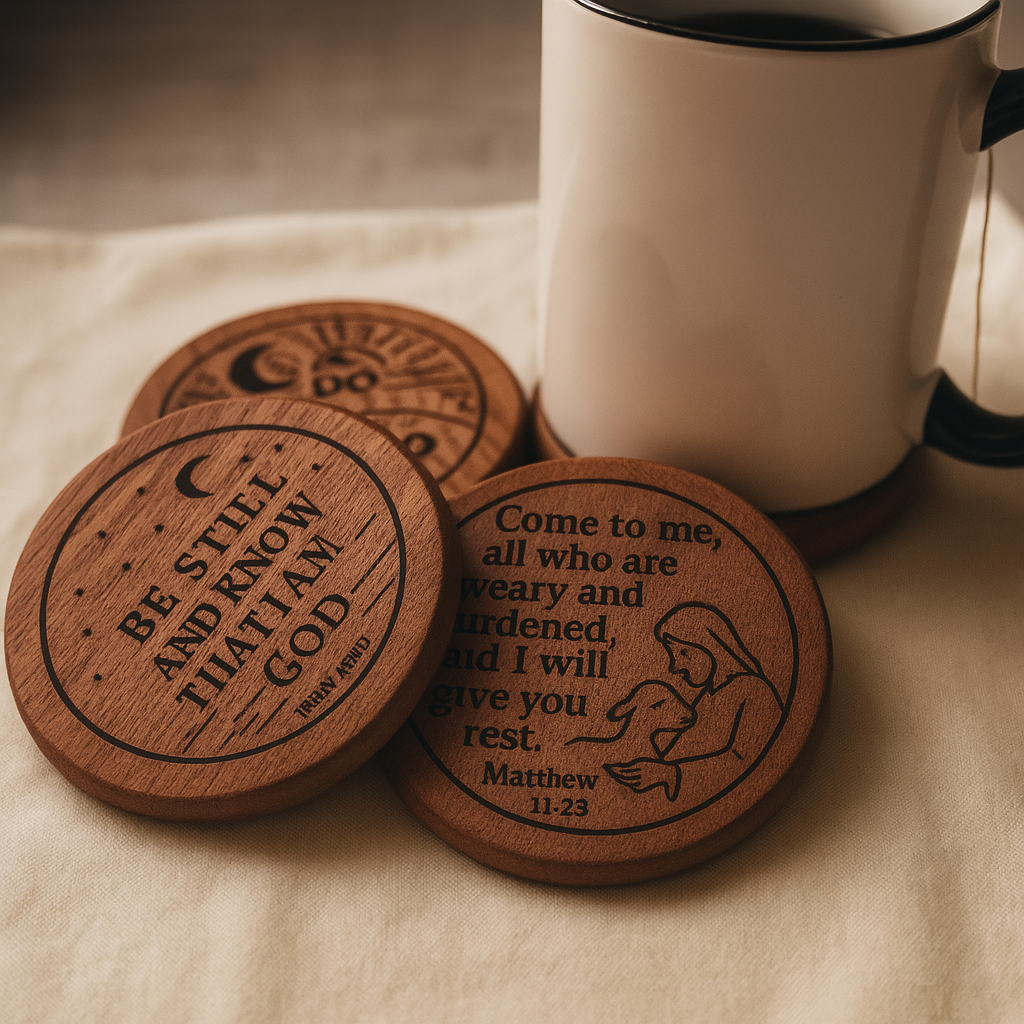 Made from smooth, dark walnut wood with natural grain, these coasters are not only functional but deeply meaningful. Every verse was prayerfully chosen, every design personally created and laser-engraved with care โ to remind you daily of Godโs presence, peace, and strength. For custom orders, your chosen verse or name will be designed and confirmed with you before engraving, making each set truly one-of-a-kind.